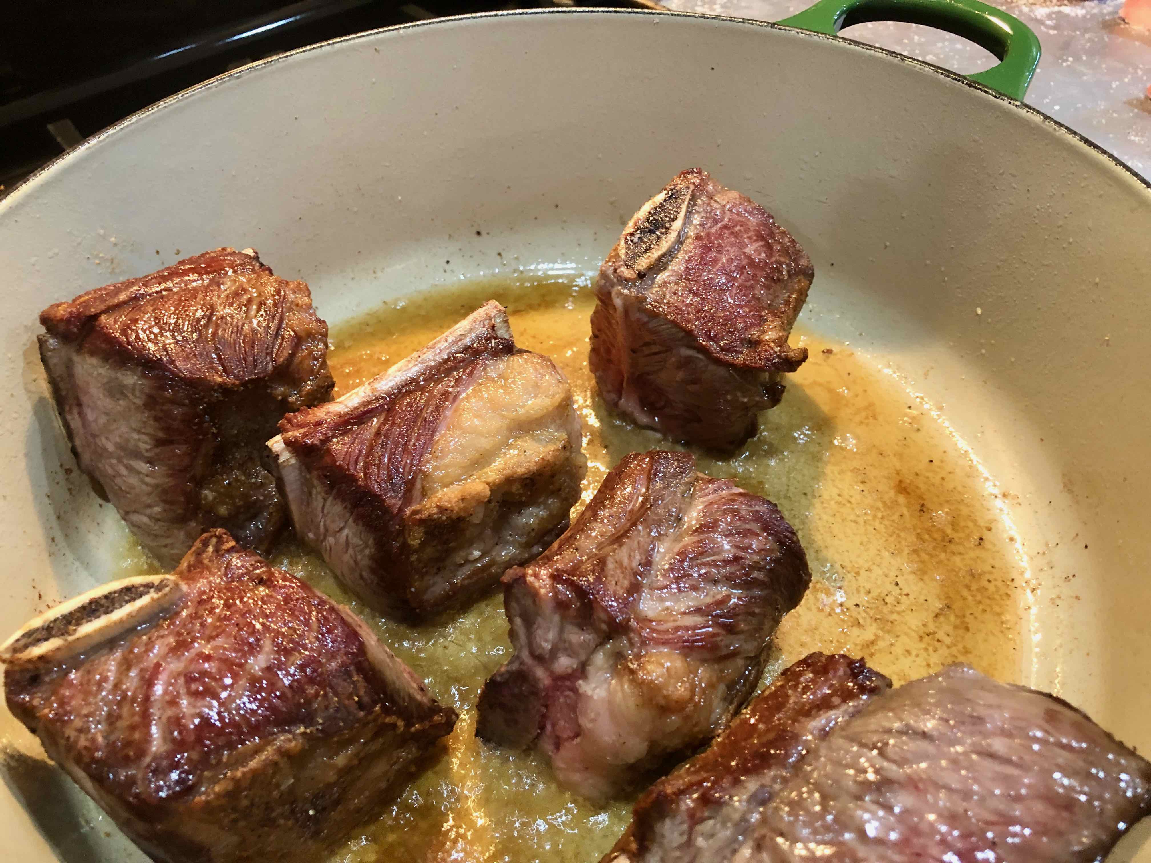 3. Heat the oil in a large (at least 8-quart) Dutch oven over medium heat. Working in batches, sear the short ribs until deeply golden brown all on all sides, 12-15 minutes. Using tongs, transfer the short ribs to a large serving platter or rimmed baking sheet. (Start with fat side down.)