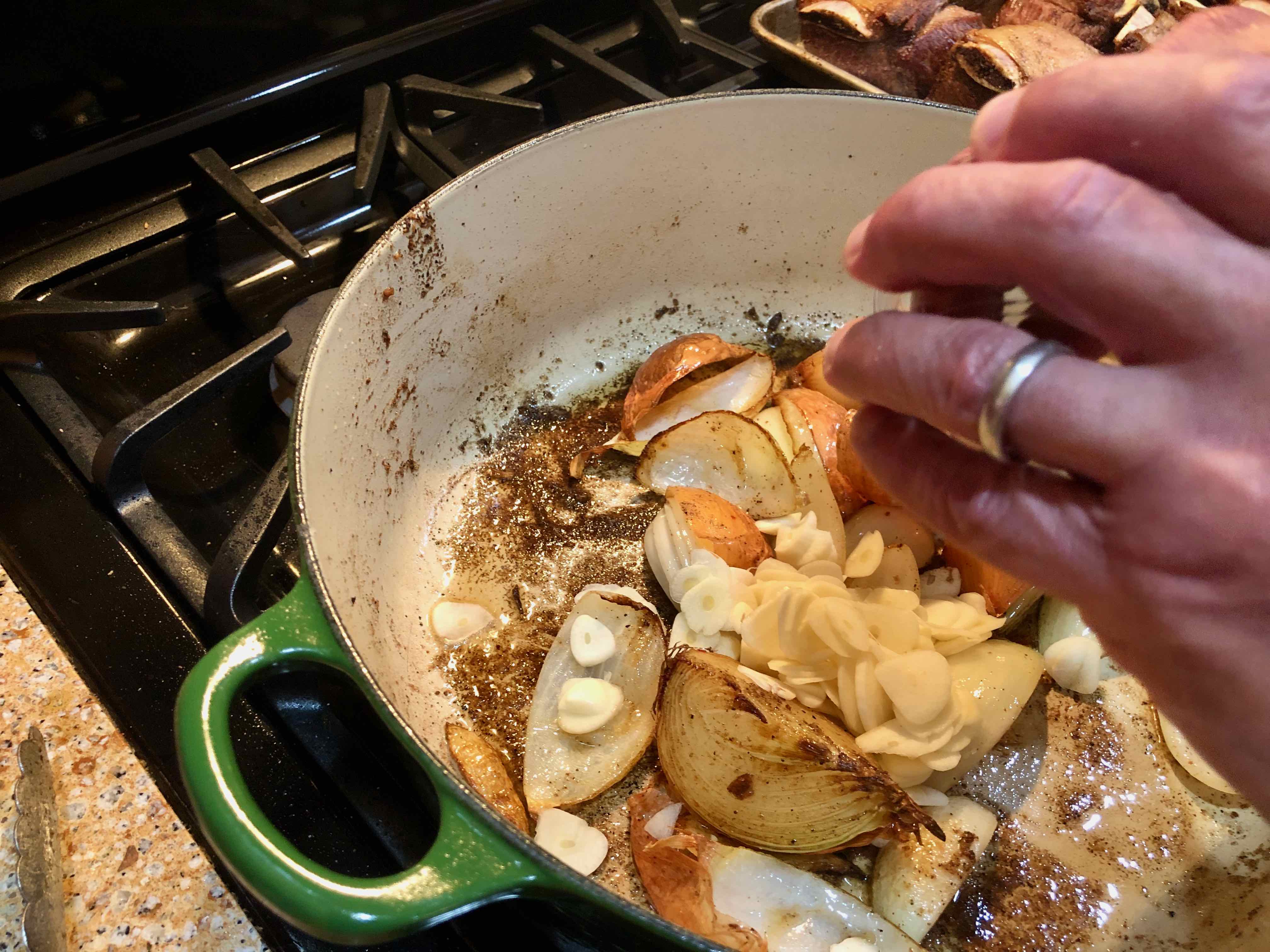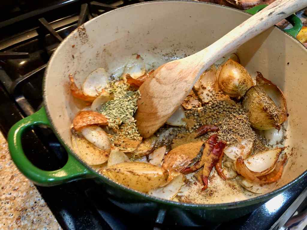 7. Add onions to the pot and season with salt and pepper. Cook, stirring occasionally until the onions have a nice golden-brown color to them, 5–8 minutes, and midway through, add the sliced garlic. Add the 4 whole chiles, or red-pepper flakes, cumin seeds, fennel seeds, coriander seeds, and cinnamon, stirring to coat and toast the spices.