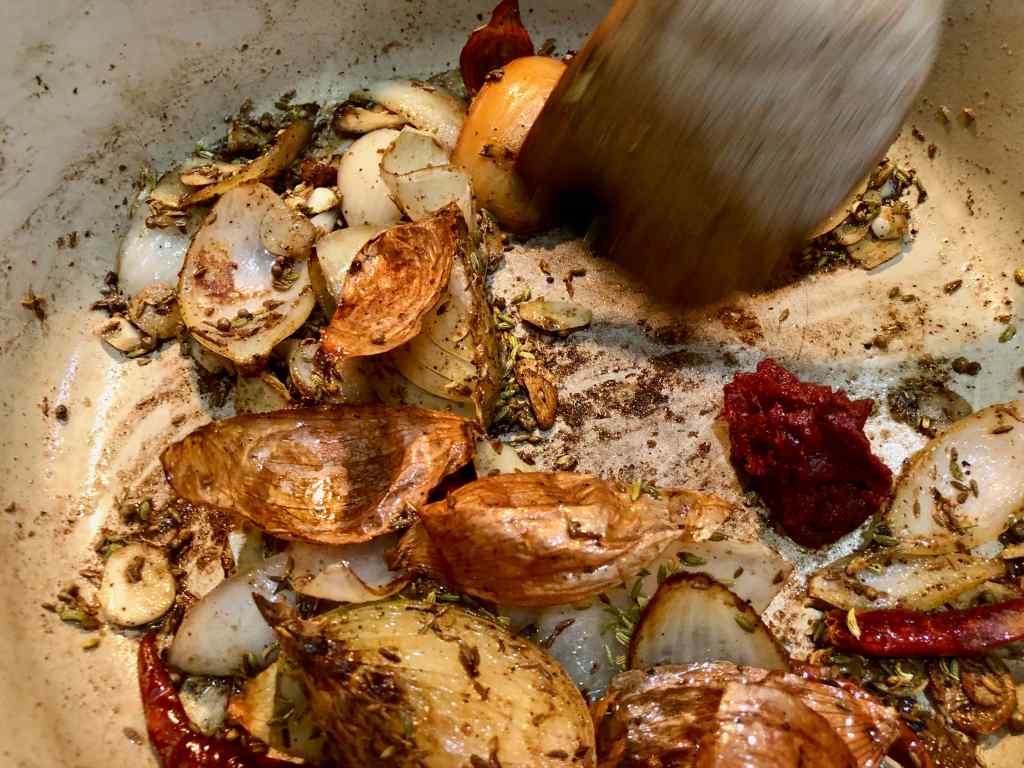 8. Add the tomato paste and cook, stirring constantly, until it’s started to caramelize on the bottom of the pot (adjust the heat as needed to make sure it doesn’t burn before it caramelizes), about 2 minutes.