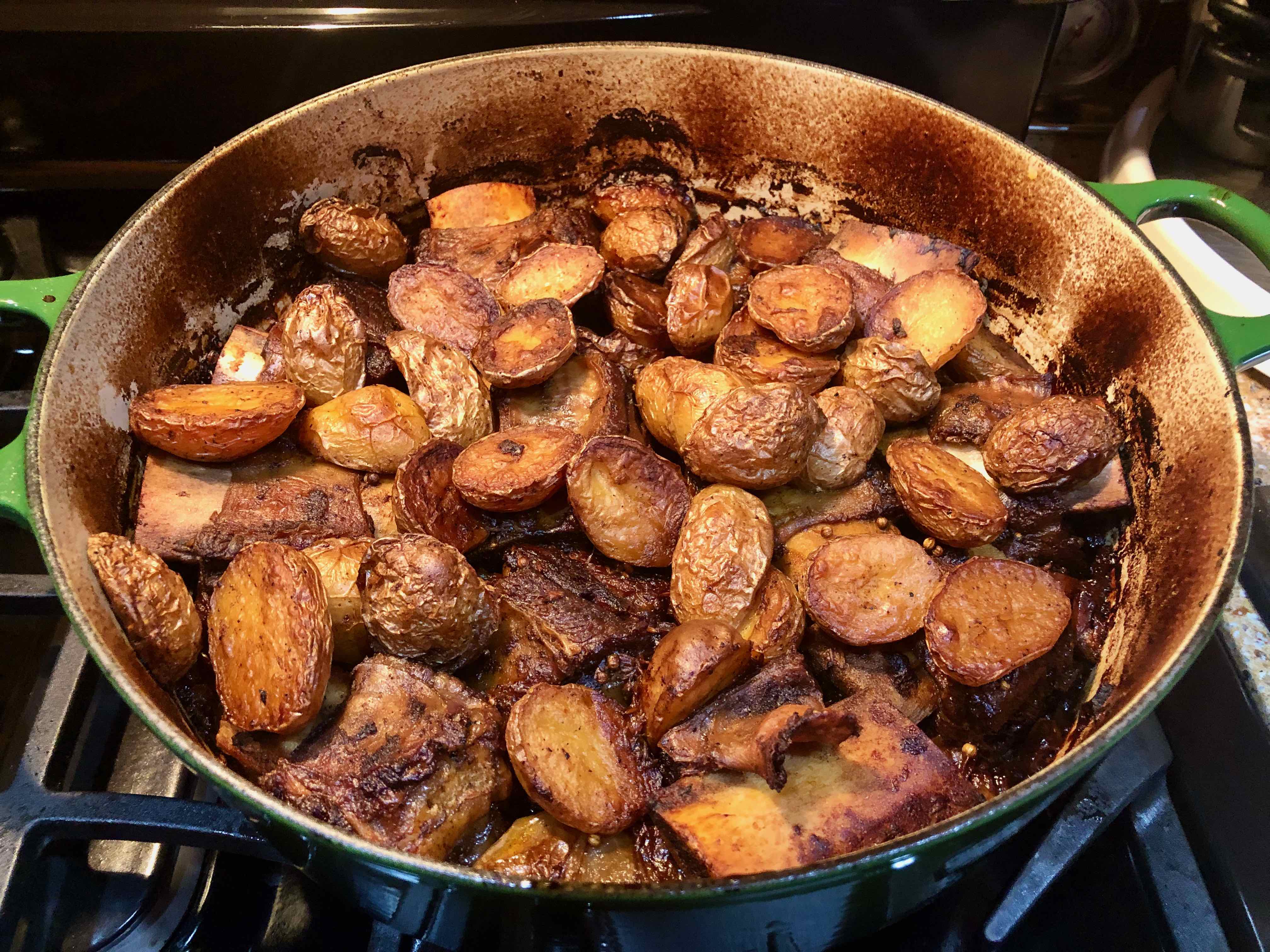 10. Return the short ribs meat side down and the potatoes to the pot, nestling everything in (if it’s a tight squeeze just make sure the short ribs get priority seating on the braise train, which is to say make sure they are submerged even if the potatoes are not.