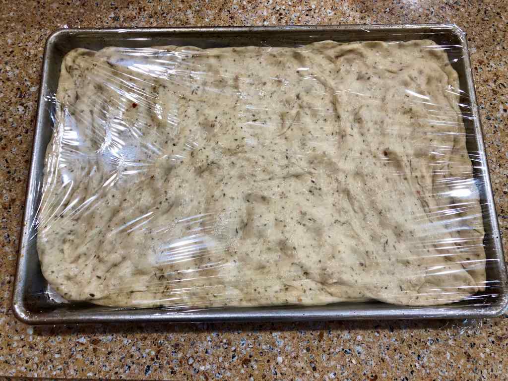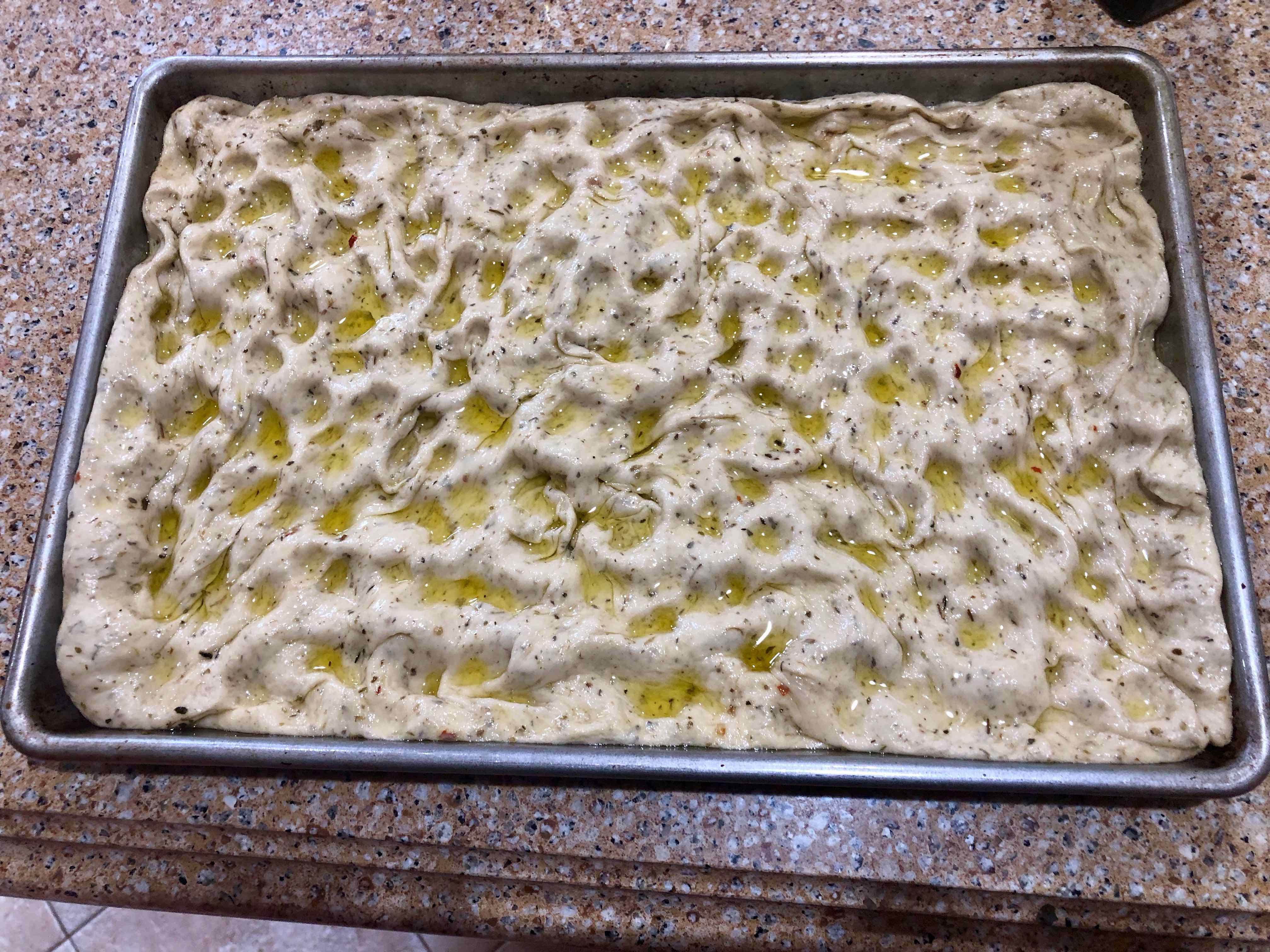 3. When the dough cycle is finished, remove the dough from the bread pan and place it on a 9- x 13-inch rimmed sheet pan pan brushed with 2 generous tablespoons of olive oil. Punch the dough down to deflate it, turn it over, and spread the oil evenly. Let the dough rest for 10 minutes.