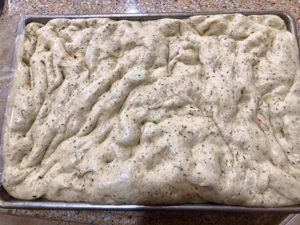 11. Preheat the oven to 450°F. Bake for approximately 20 minutes or until lightly golden brown. You may want to turn the focaccia mid-way through. Keep an eye on it for the last few minutes to avoid burning.