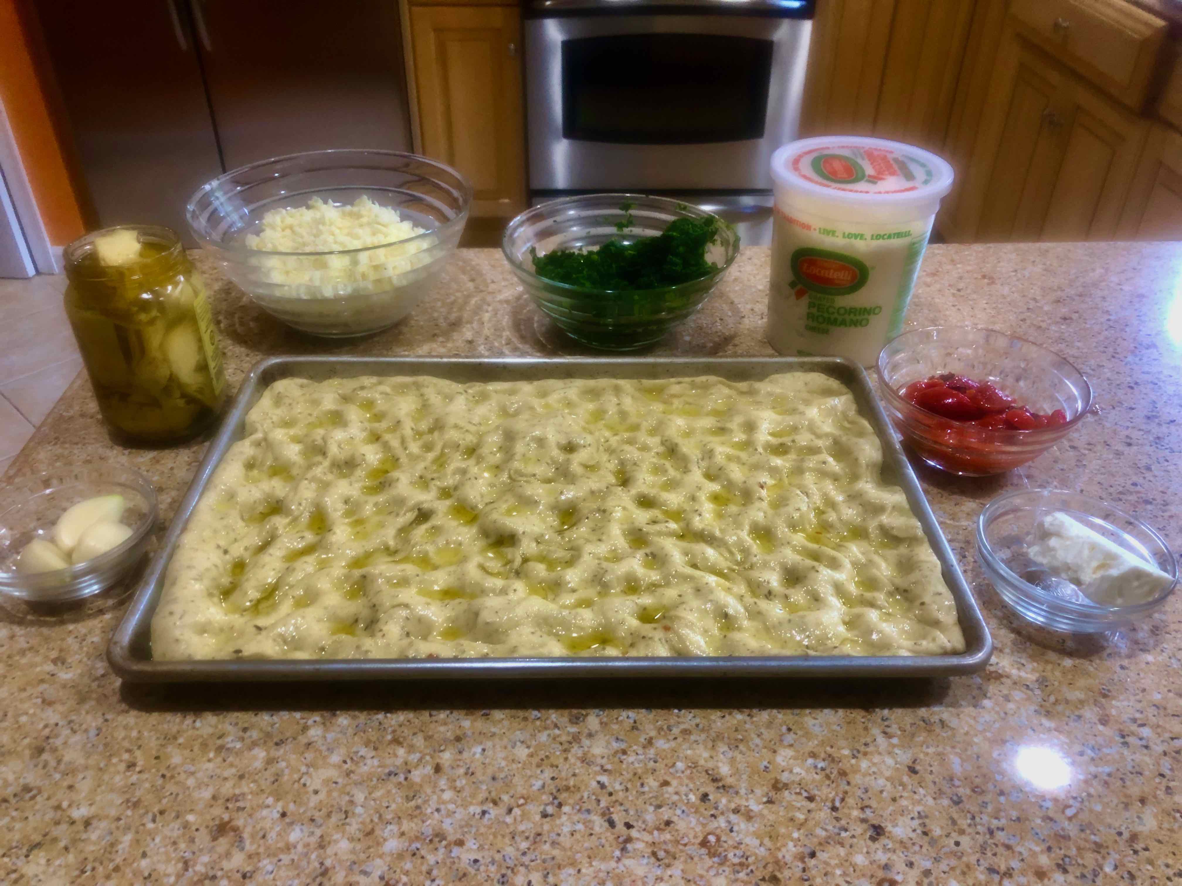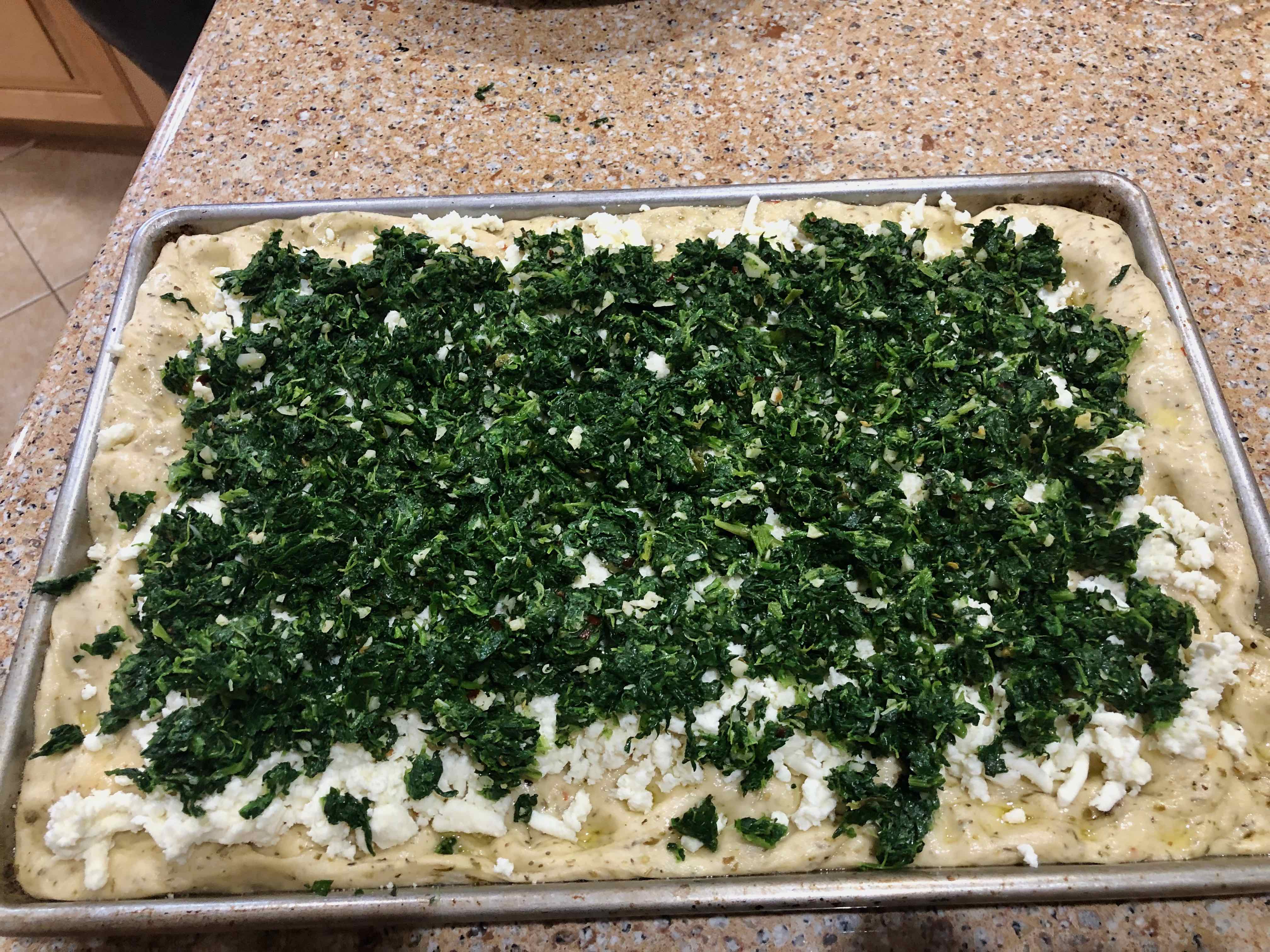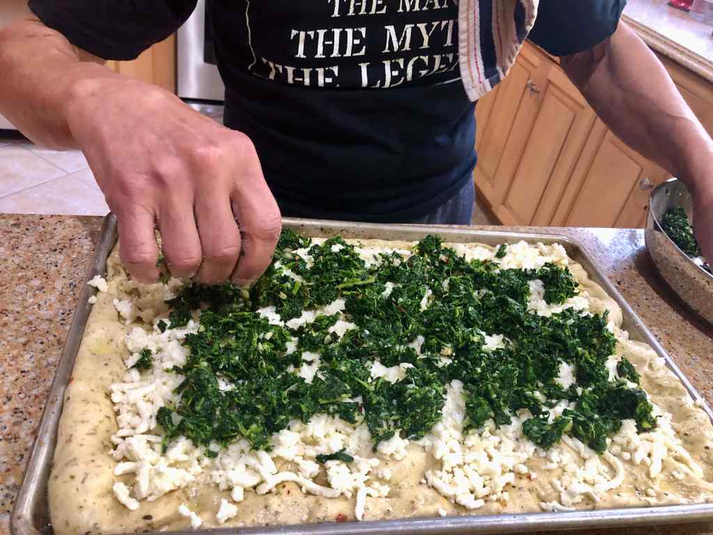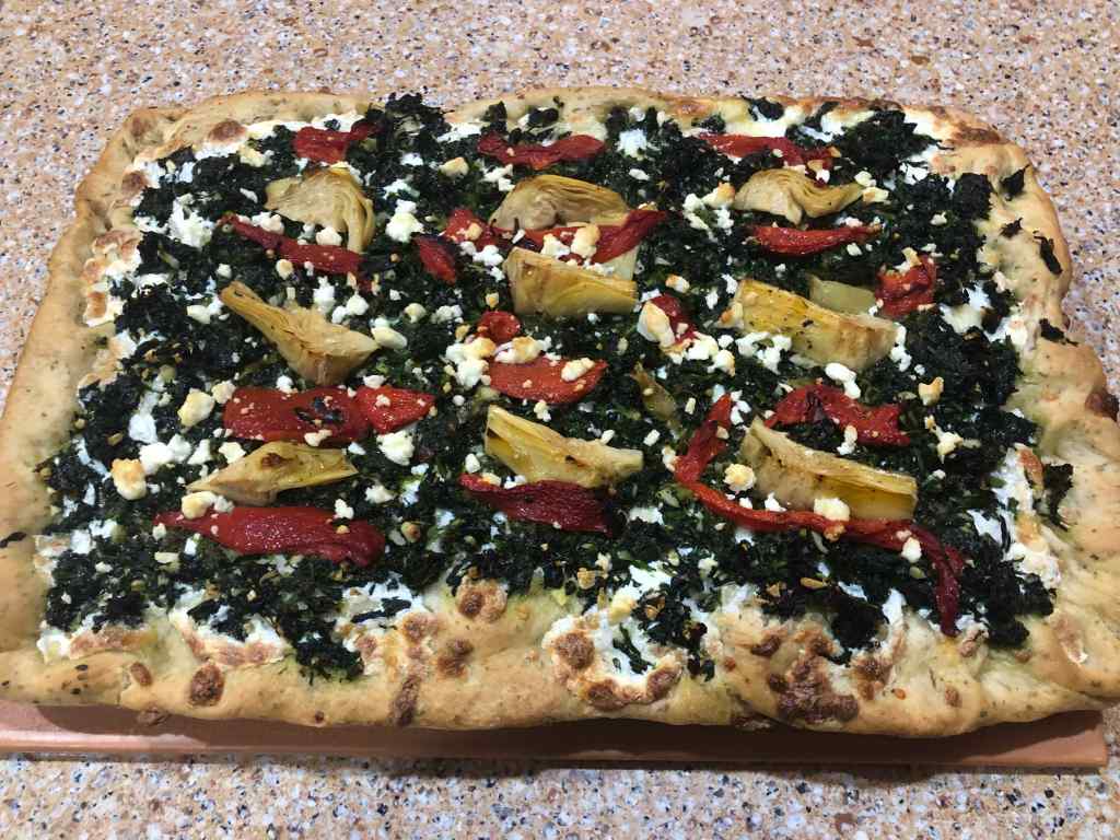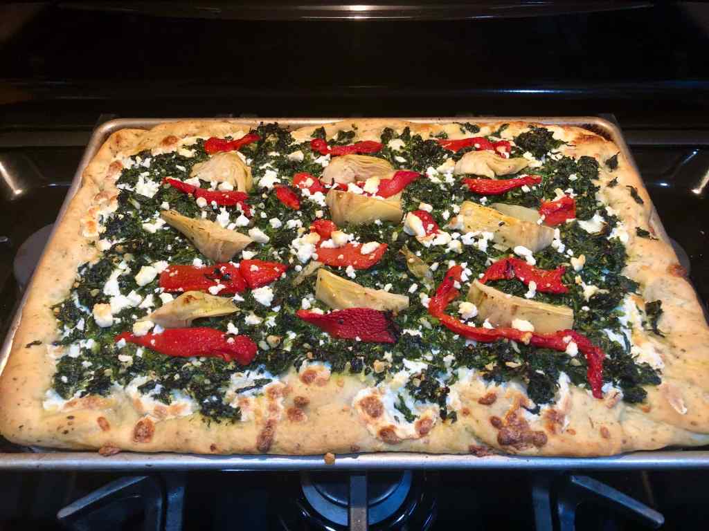 I first enjoyed this focaccia thirty years ago while I was staying with friends after I moved back east from California and started to look for a house. Since my search took far longer than expected, I enjoyed many dinners with them and their two children, both of whom often requested what they called “Spinach Pizza” from a local deli, aptly named “The Best of Everything.” We enjoyed one at least every other week. It was a thick rectangular pizza, with a layer of melted mozzarella covered with garlicy sautéed spinach and topped with marinated artichoke hearts and marinated roasted red pepper.