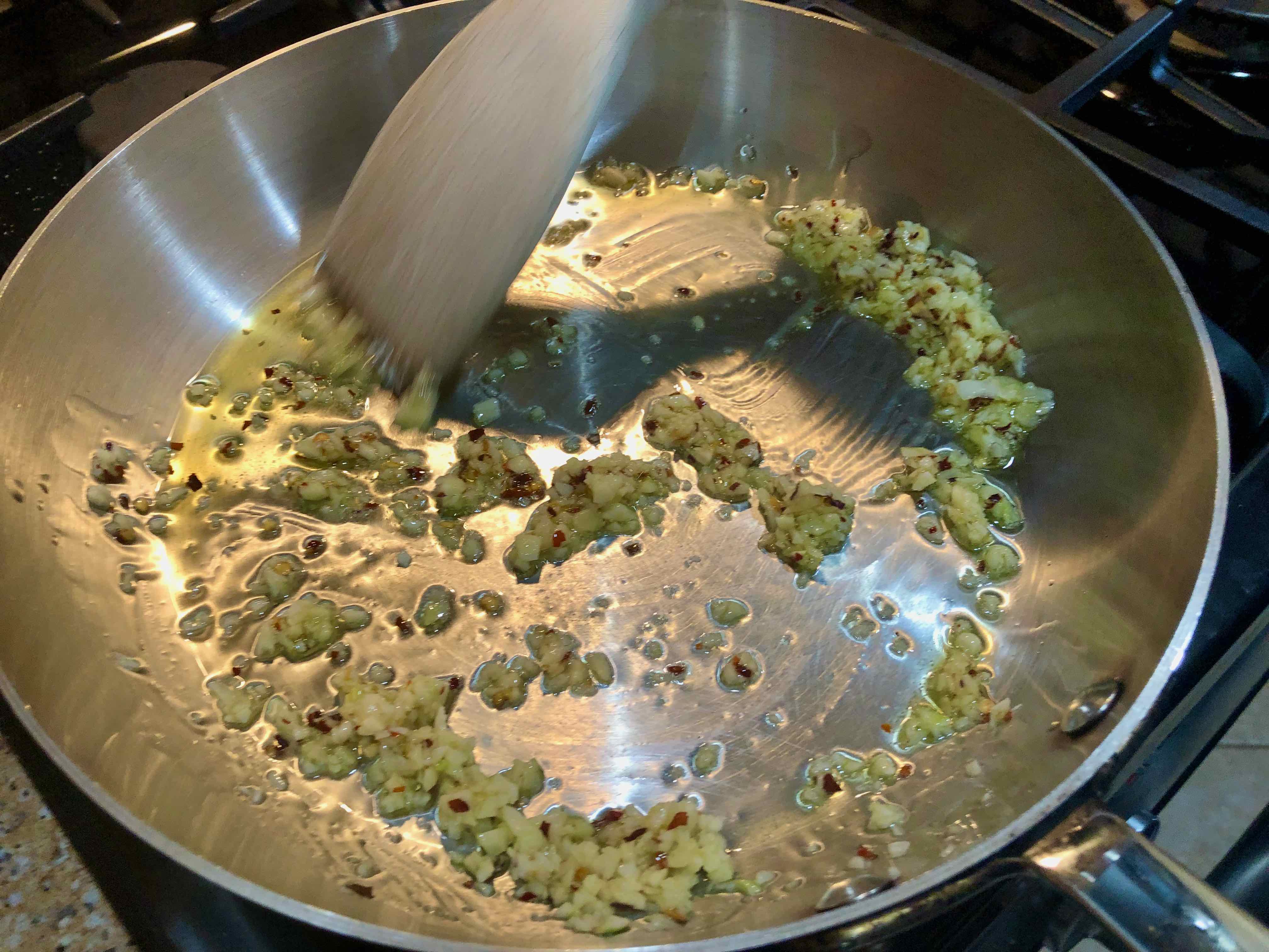 Meanwhile, mince 3 large cloves of garlic. Heat 3 teaspoons of extra-virgin olive oil in a skillet over medium heat. When the oil is hot, add the minced garlic along with ½ teaspoon of crushed red pepper flakes and sauté just until fragrant. Add the spinach to the pan, and sauté for 2 minutes.