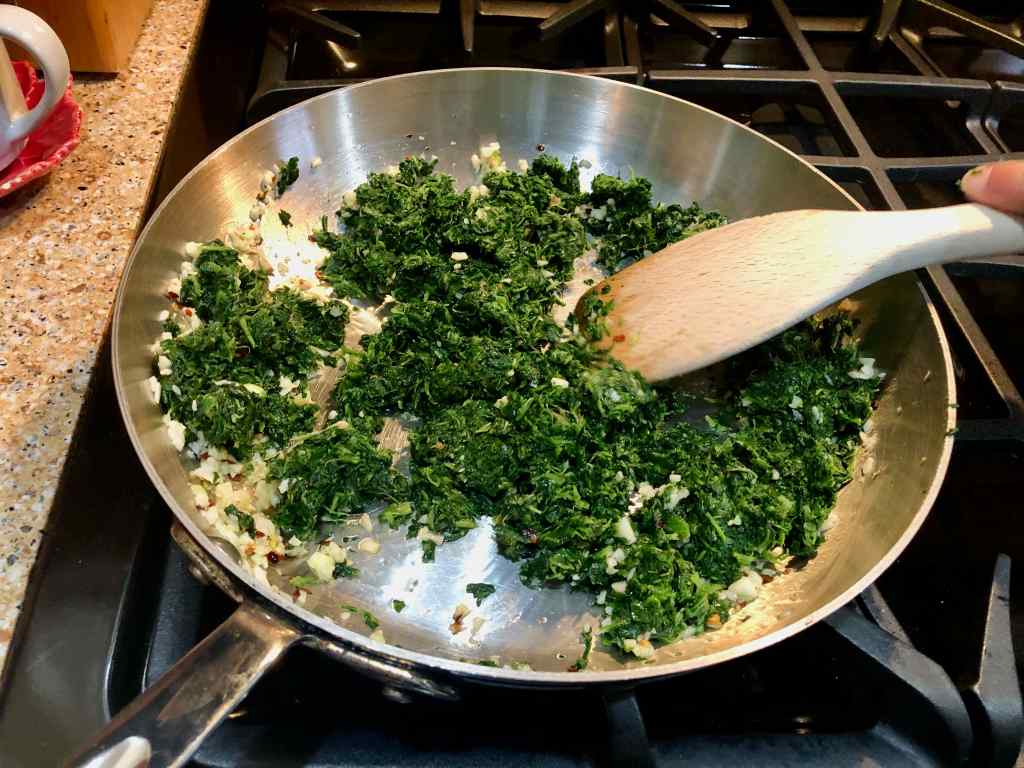 20 ounces frozen chopped spinach, thawed, drained, and sautéed in garlic and olive oil with crushed red-pepper flakes (See Note below.)
