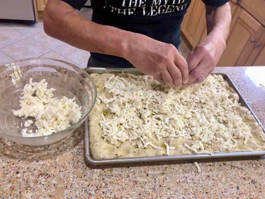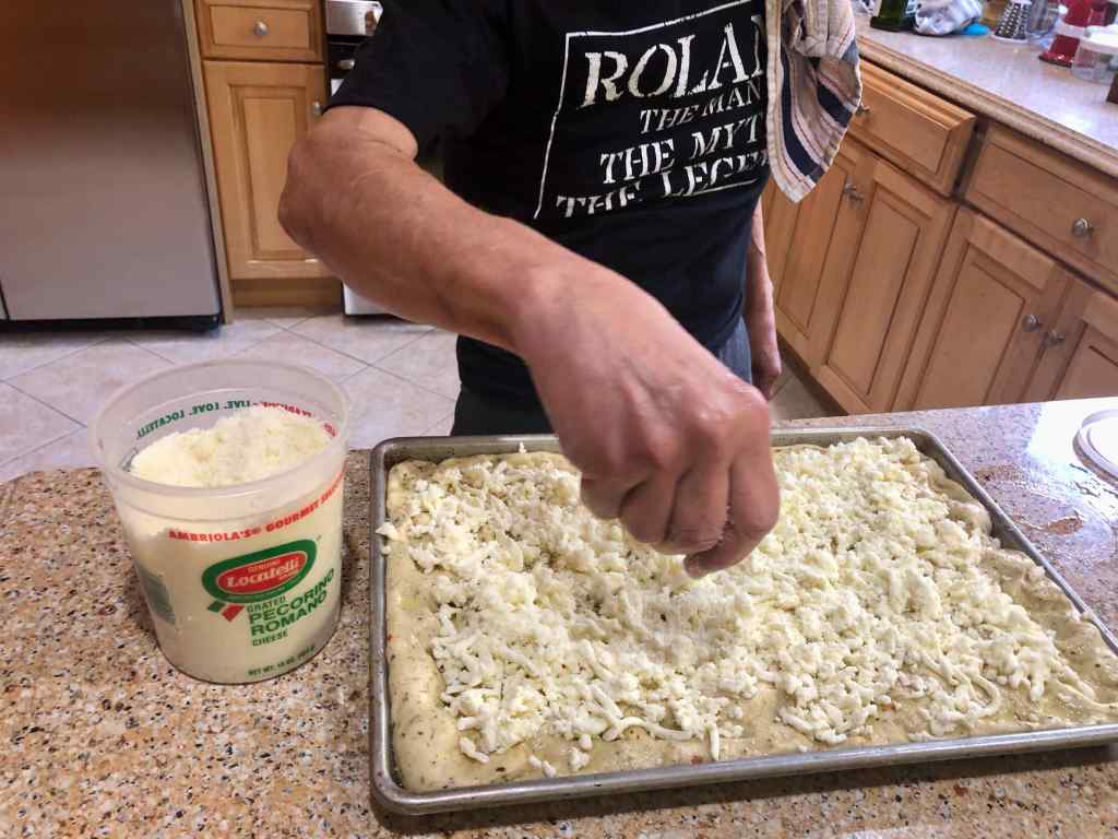 7. Sprinkle the grated mozzarella evenly over the top of the dough, followed by a sprinkling of the Romano.