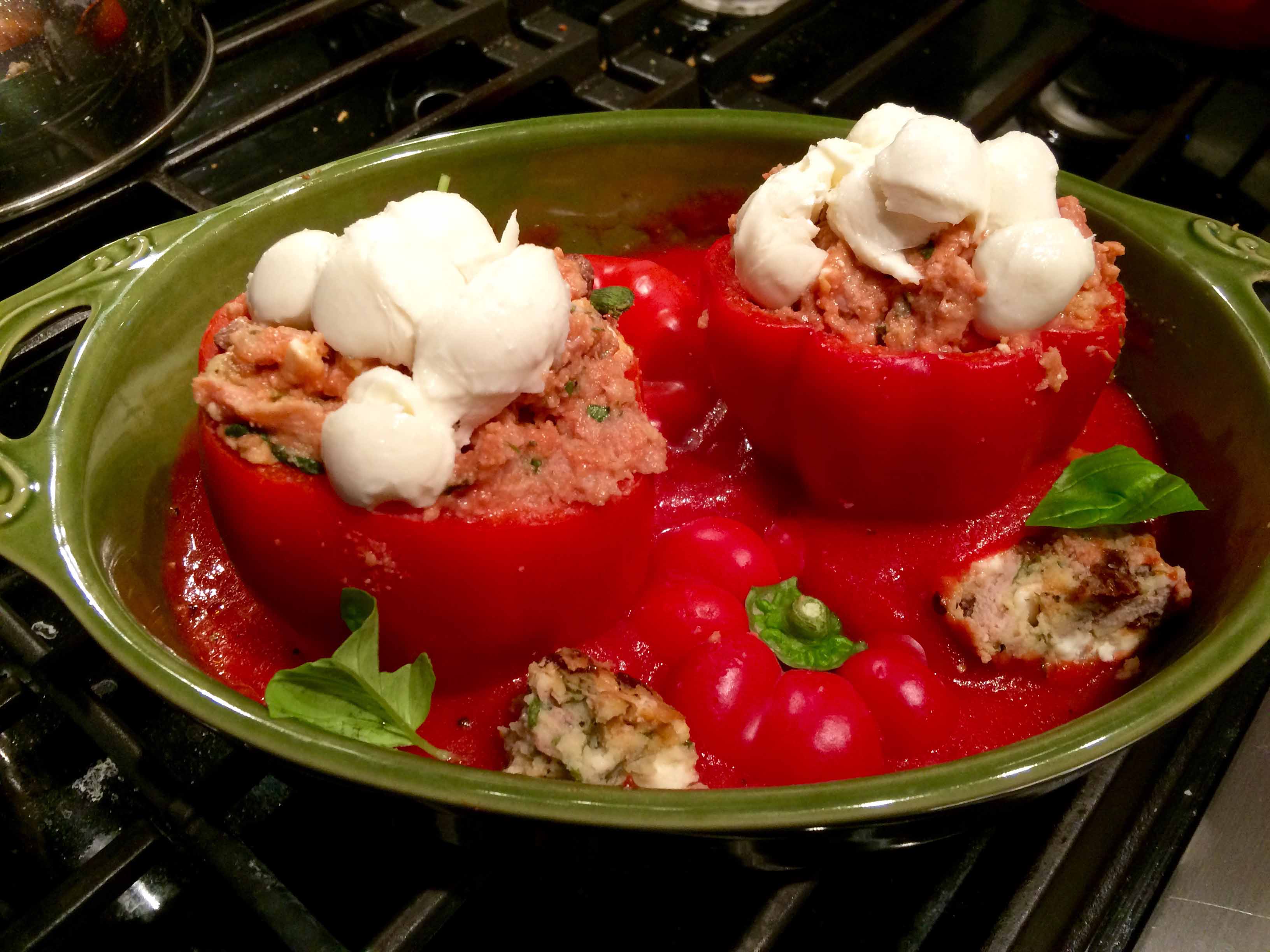 After lightly drizzling the cooled peppers with some olive oil, I generously stuffed them and topped them with some fresh mozzarella. I then placed them in a baking dish to which I added about a half cup of the passata sauce together with some chunks of the meatloaf, the pepper tops, and some fresh basil. They cooked in the oven for about 50 minutes until the peppers were cooked through and the cheese was nicely browned.
