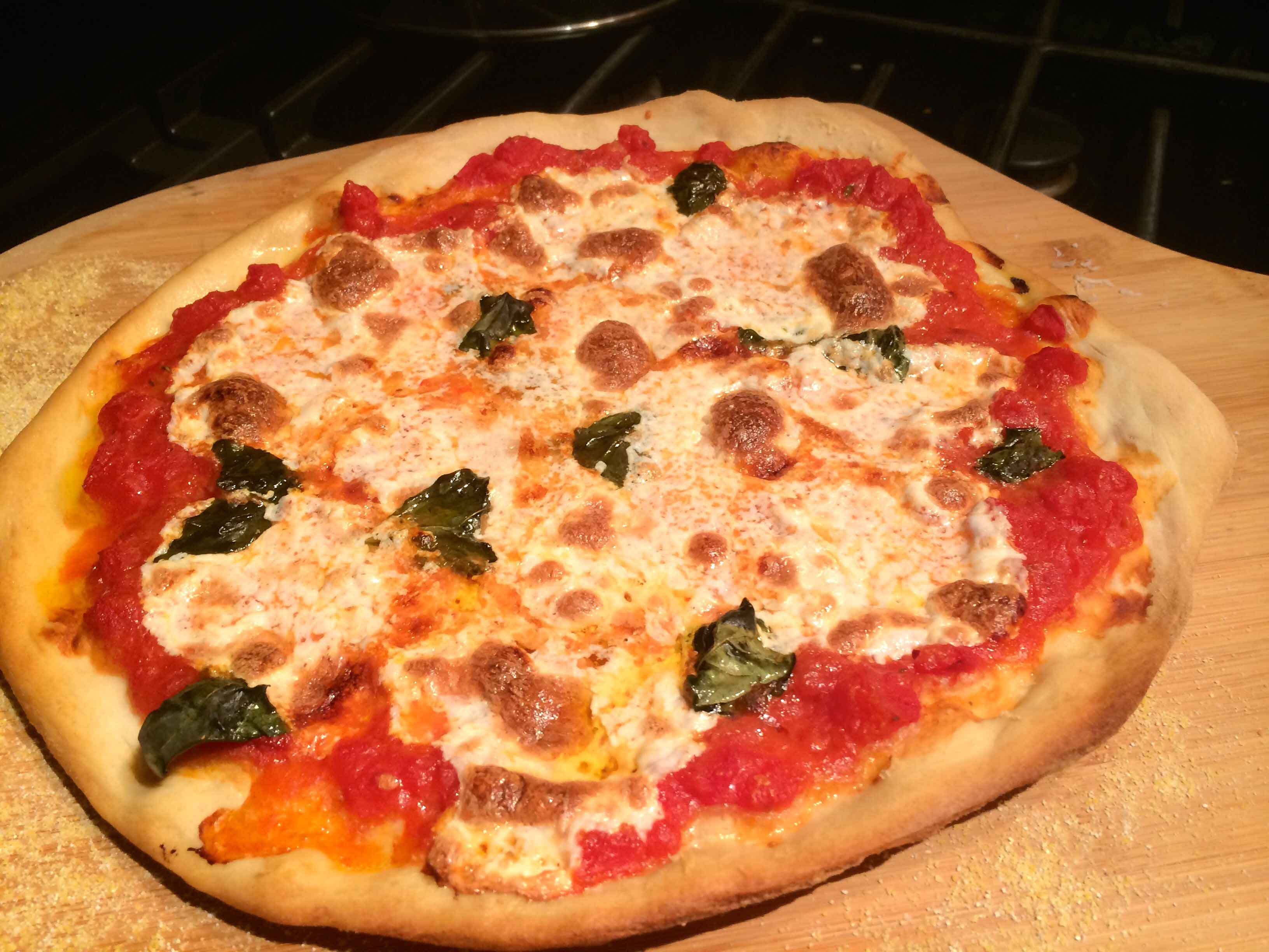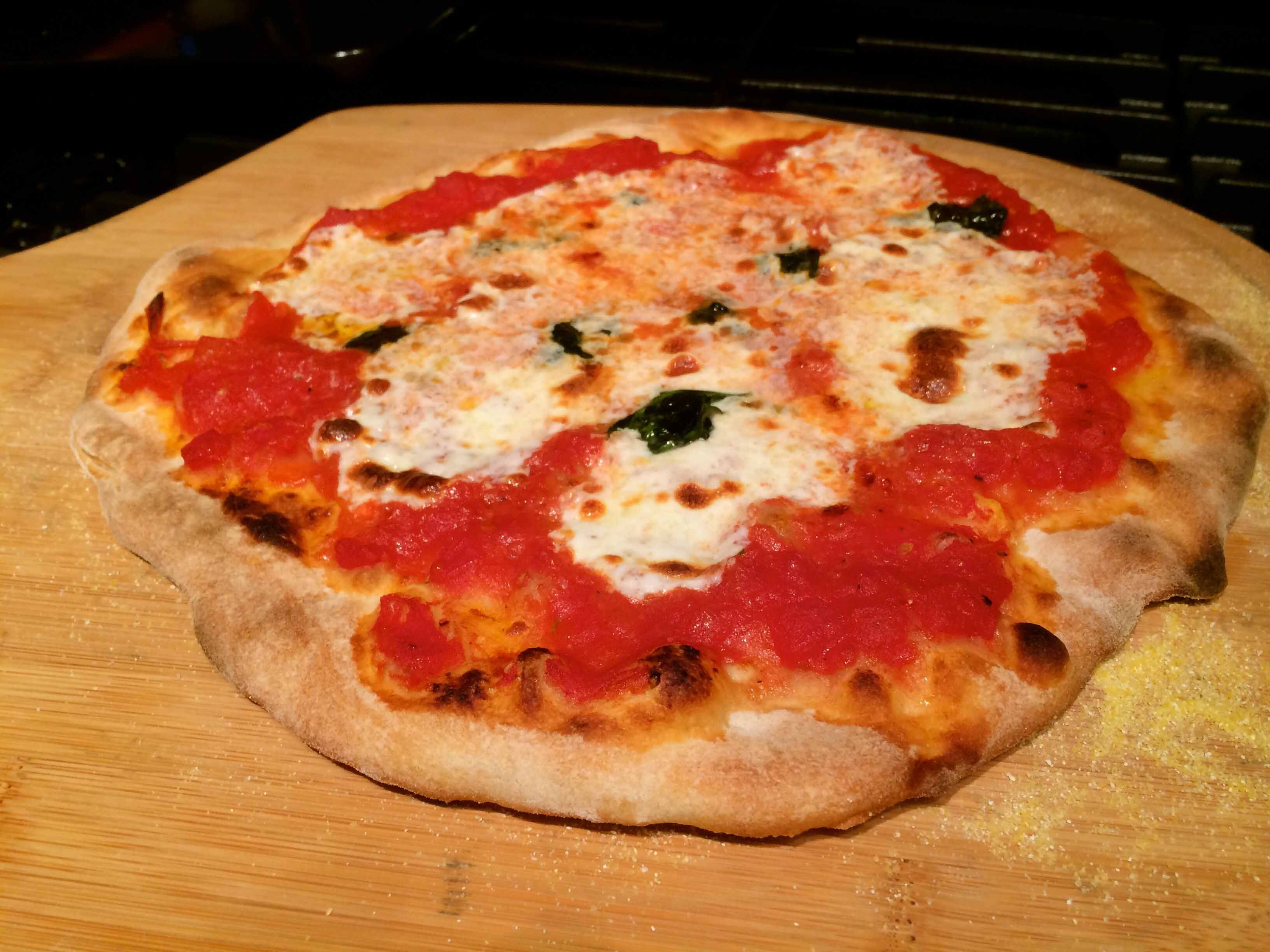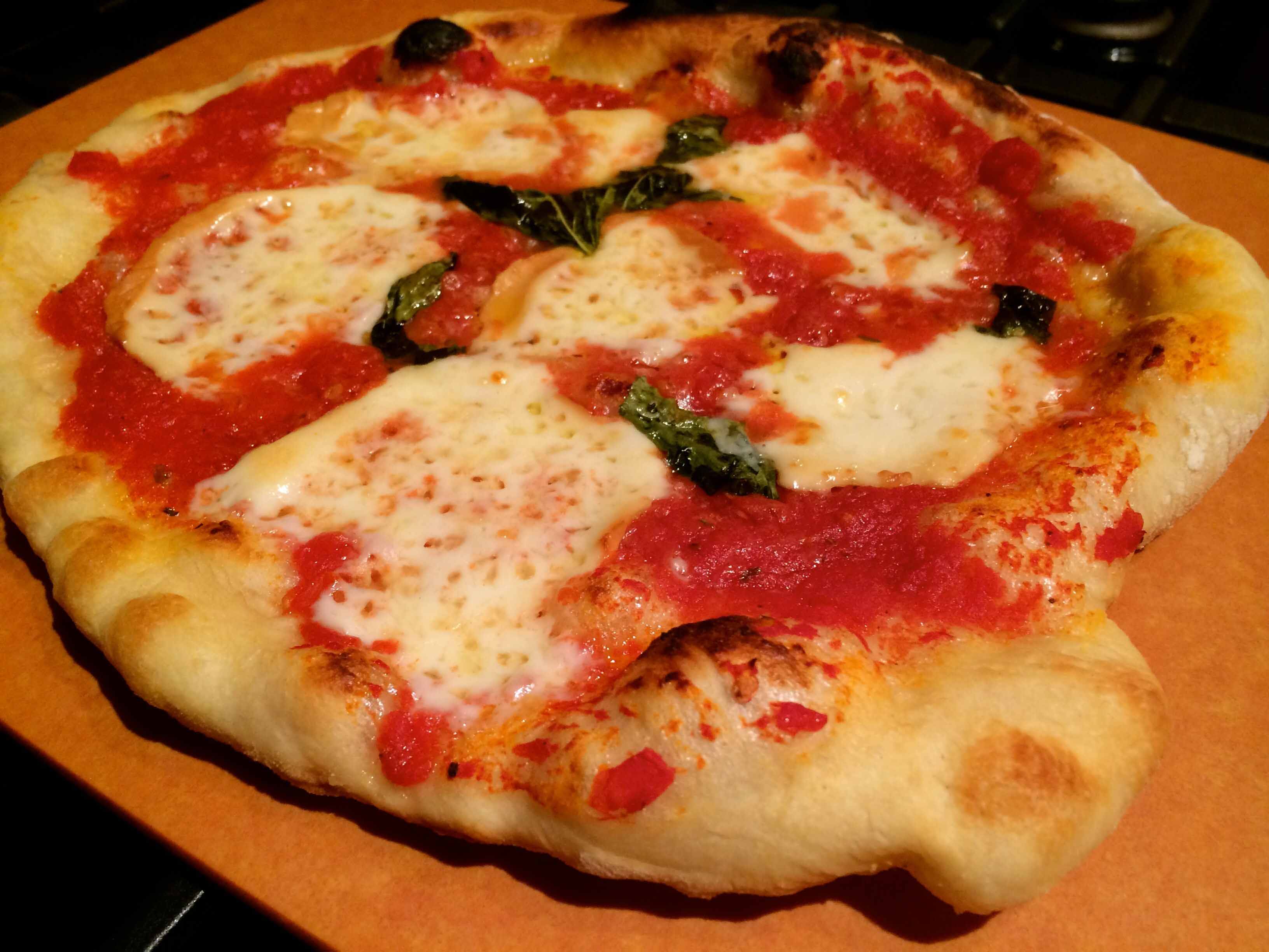 I’m happy to report that the combination of the new dough recipe and pizza oven yielded my best homemade pizza to date. As the oven only accommodates at most a 12-inch pizza, I chose to make two Margherita pizzas with the dough, each slightly shy of the appliance’s maximum diameter.