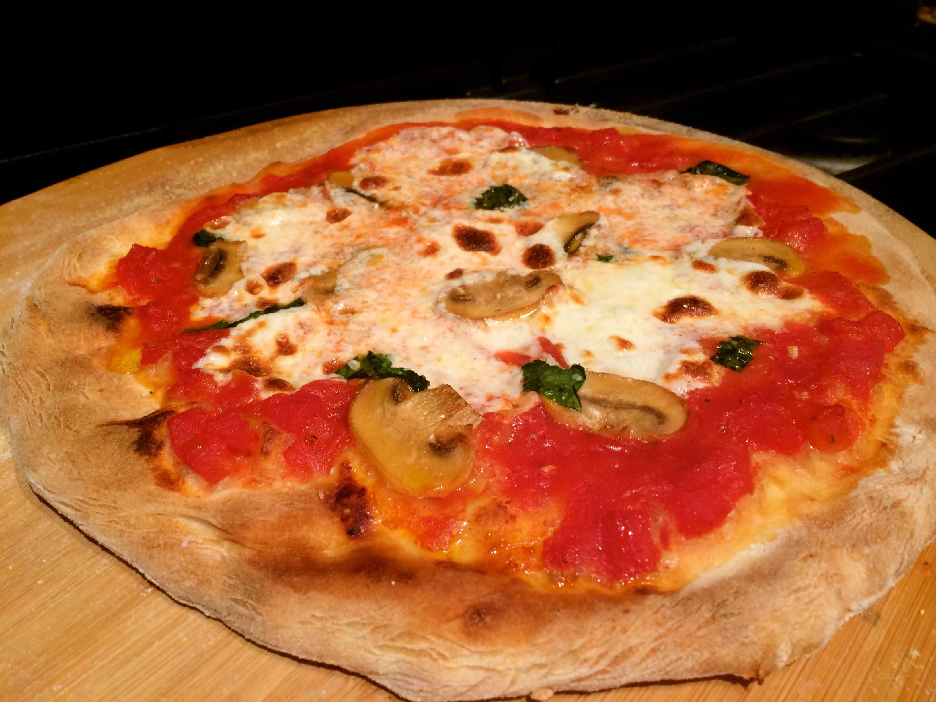 Last night, I used it for the first time. I’m a convert. It worked as advertised and delivered the best pizzas I’ve made to date: one Margherita, pictured above, and one mushroom, pictured below. I was hesitant to cook the pizzas so close to the broiler so I placed the steel on the third position in the oven. And although they took about 6 minutes more than those on Serious Eats, they were perfectly cooked with an even better balance between the crusts’ crisp and chew factors.