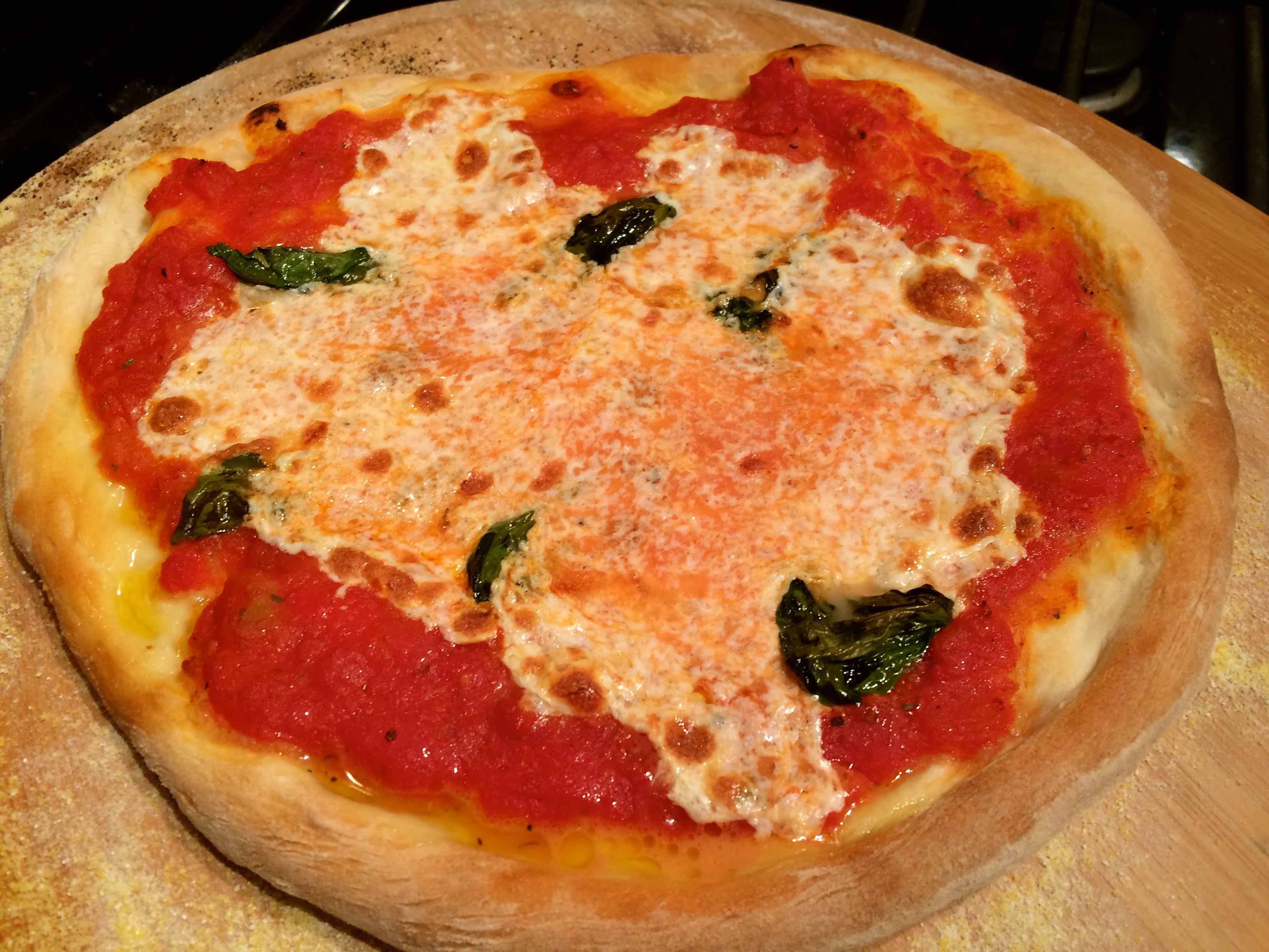 More often than not, I use this crust for a Pizza Margherita and sometimes top it with either arugula and prosciutto or a fried egg. The sauce for the pizza is made from uncooked, canned crushed San Marzano style tomatoes, a little olive oil, salt, pepper, and oregano. For cheese, fresh mozzarella and some grated pecorino Romano. I finish it with some torn fresh basil and a drizzle of extra-virgin olive oil.