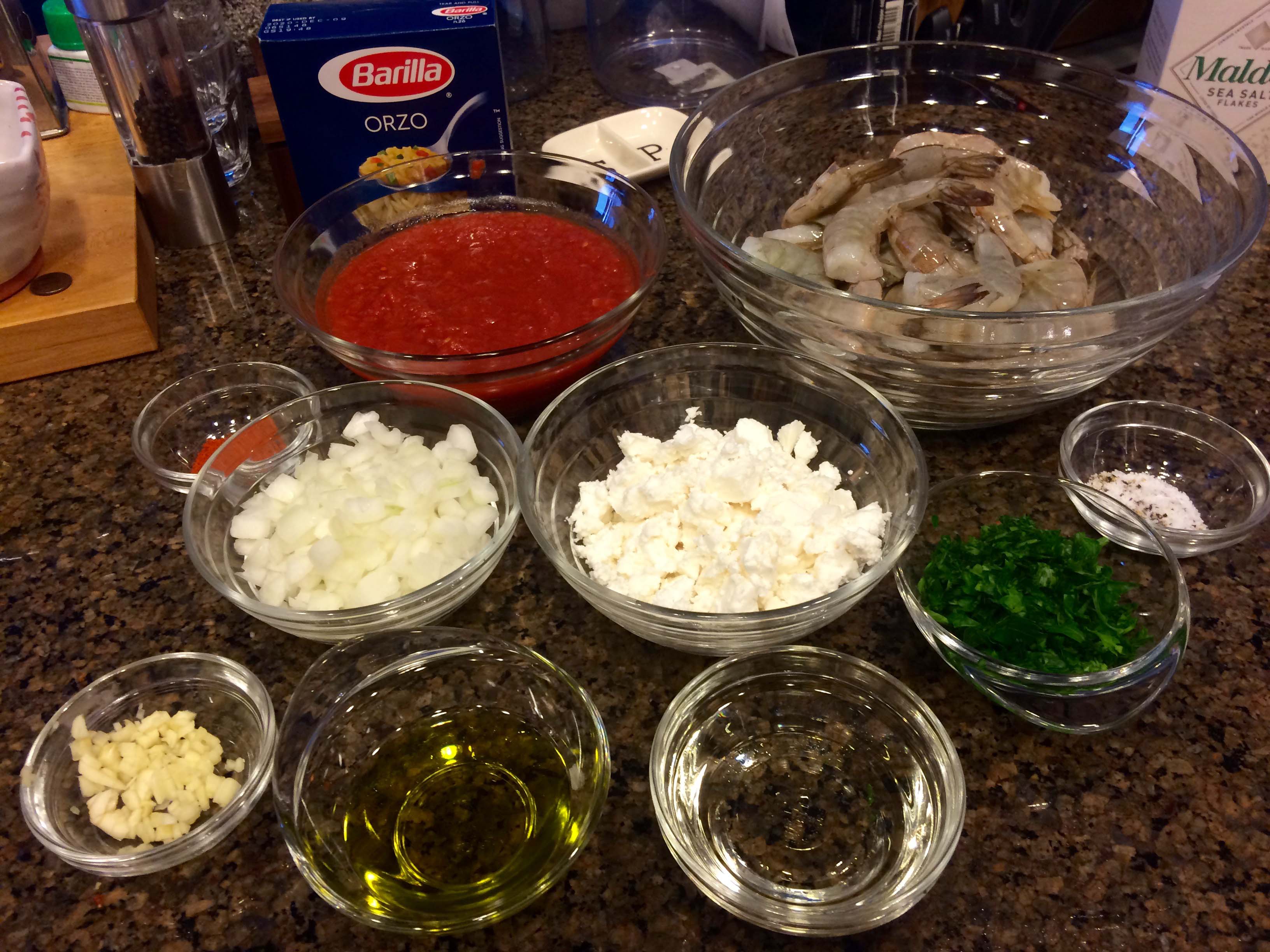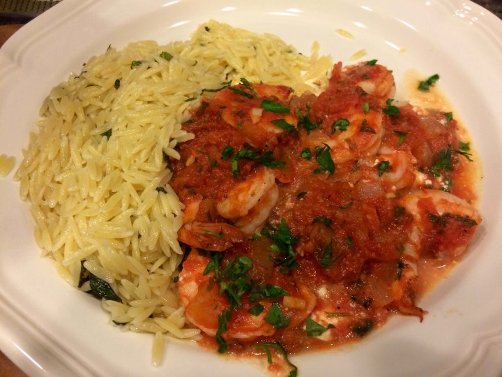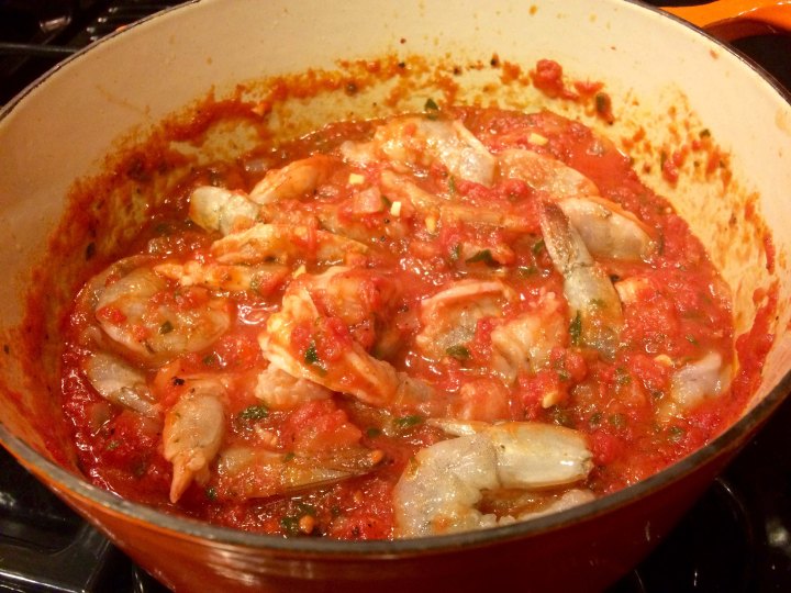 If you start with putting up the water for your pasta and prep and cook as it comes to a boil, you can have shrimp marinara on the table in about 30 minutes. Here’s my recipe: