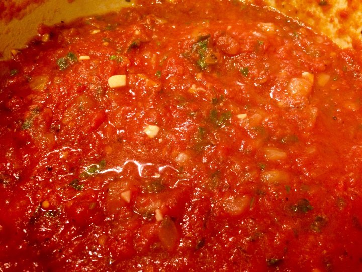 2. In a large skillet, over medium low heat sauté the garlic with the red-pepper flakes in olive oil. When they become fragrant and the garlic turns just a very pale gold, add the tomatoes, oregano, salt and pepper.