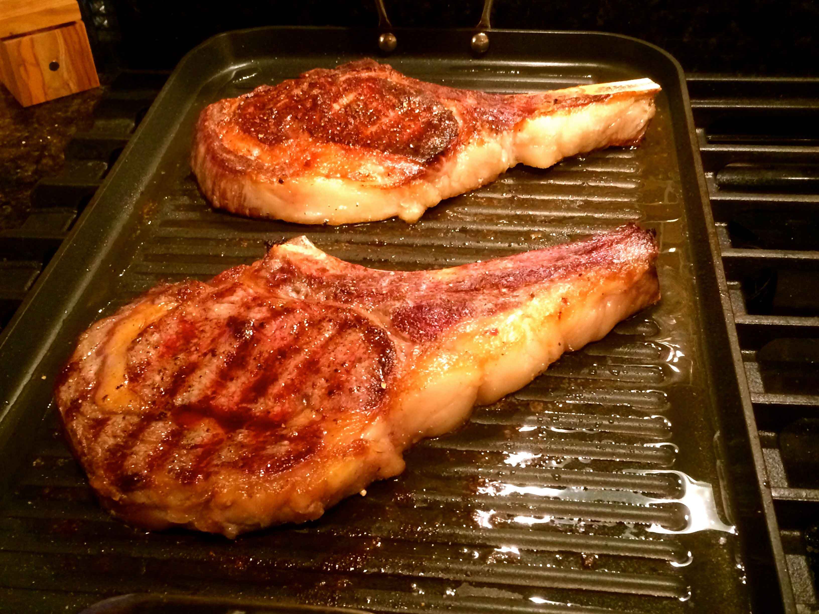 When it’s hot, I lightly oil the grill and place the steaks, seasoned side down, near the center of the pan so that they are not directly over the burners. I press down firmly on the steaks to ensure that they are in full contact with the grill and get some grill marks. Note that this is the only time I press on the meat. At this point, I season the other side as I did the first with coarse salt and black pepper.