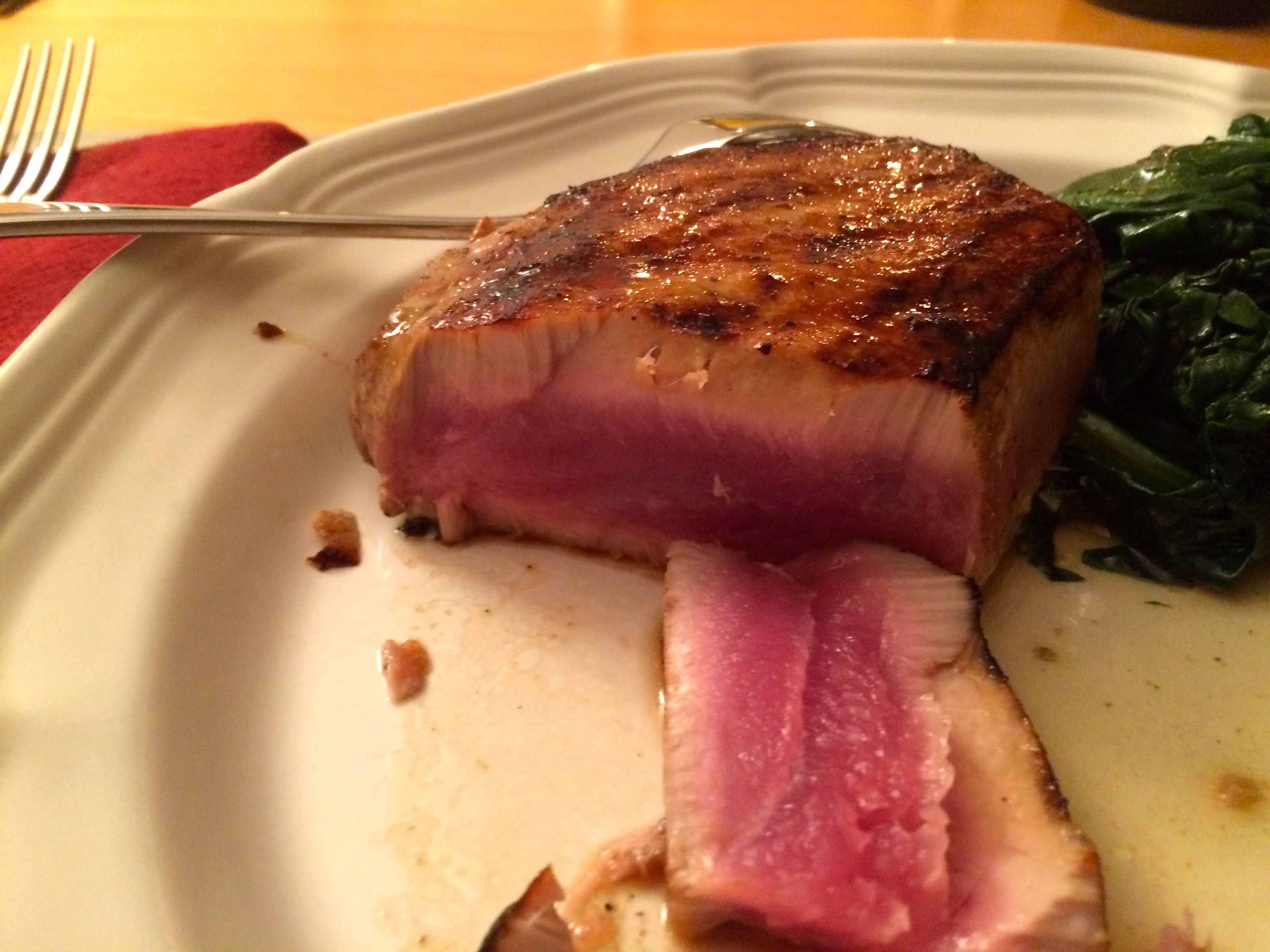 Batali used the steak as part of a sandwich that was sauced with a Parmesan fondue. As luscious as it looked, we decided to forego the sauce and the bread and chose to serve the steak accompanied with spinach sautéed with olive oil and garlic. Here’s a link to the recipe. Grilled Steak and Fondue Sandwich.