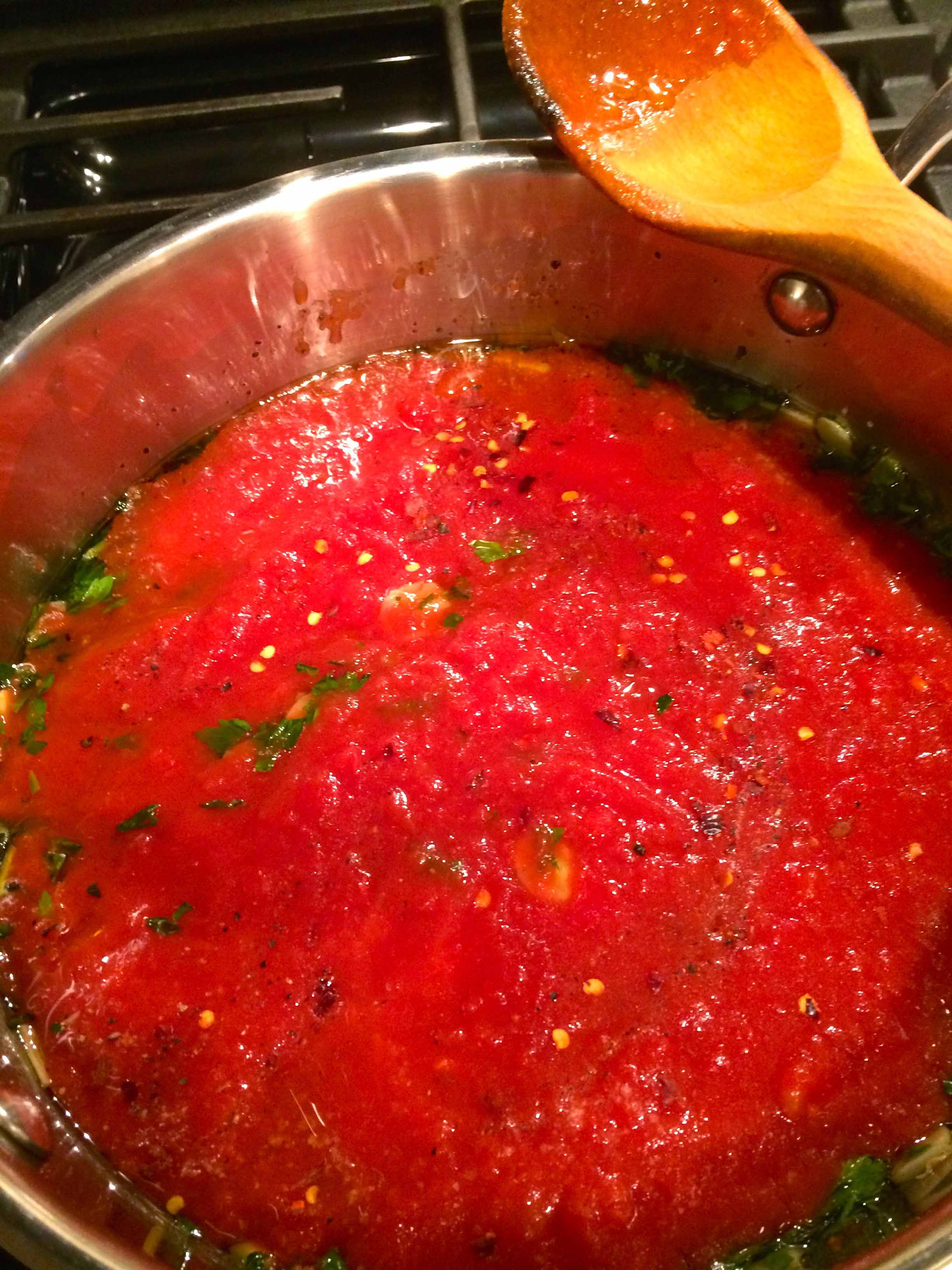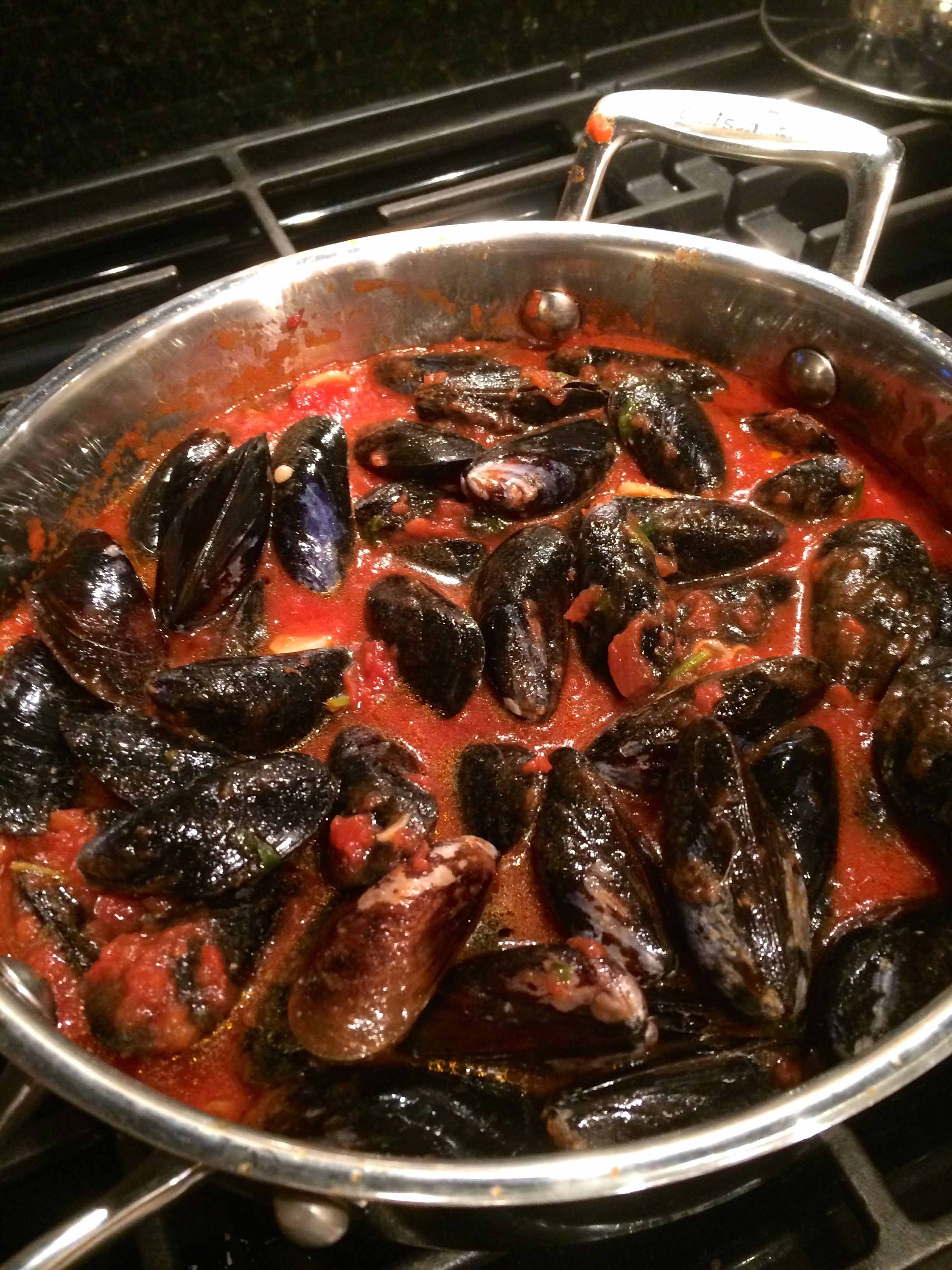 Add the mussels. Cover the pot and cook until mussels open, about 5 minutes, shaking the past once or twice.