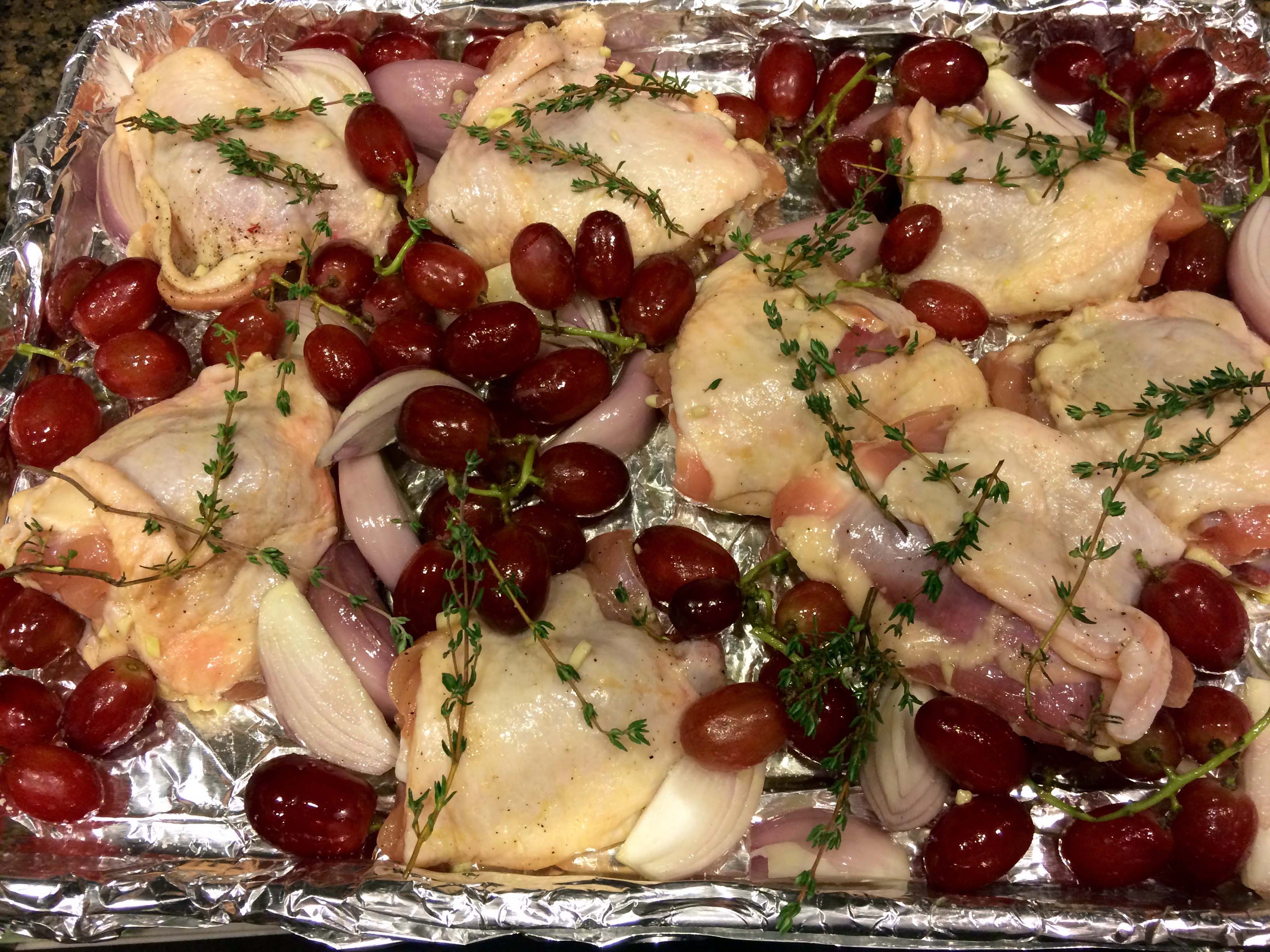 But recently a close friend from back home sent me a link to a New York Timesrecipe for sheet-pan chicken thighs with shallots and grapes. When I first saw the recipe’s photo, I thought I had already made it, but soon realized that I had only made a similar sheet-pan supper but with sausages.